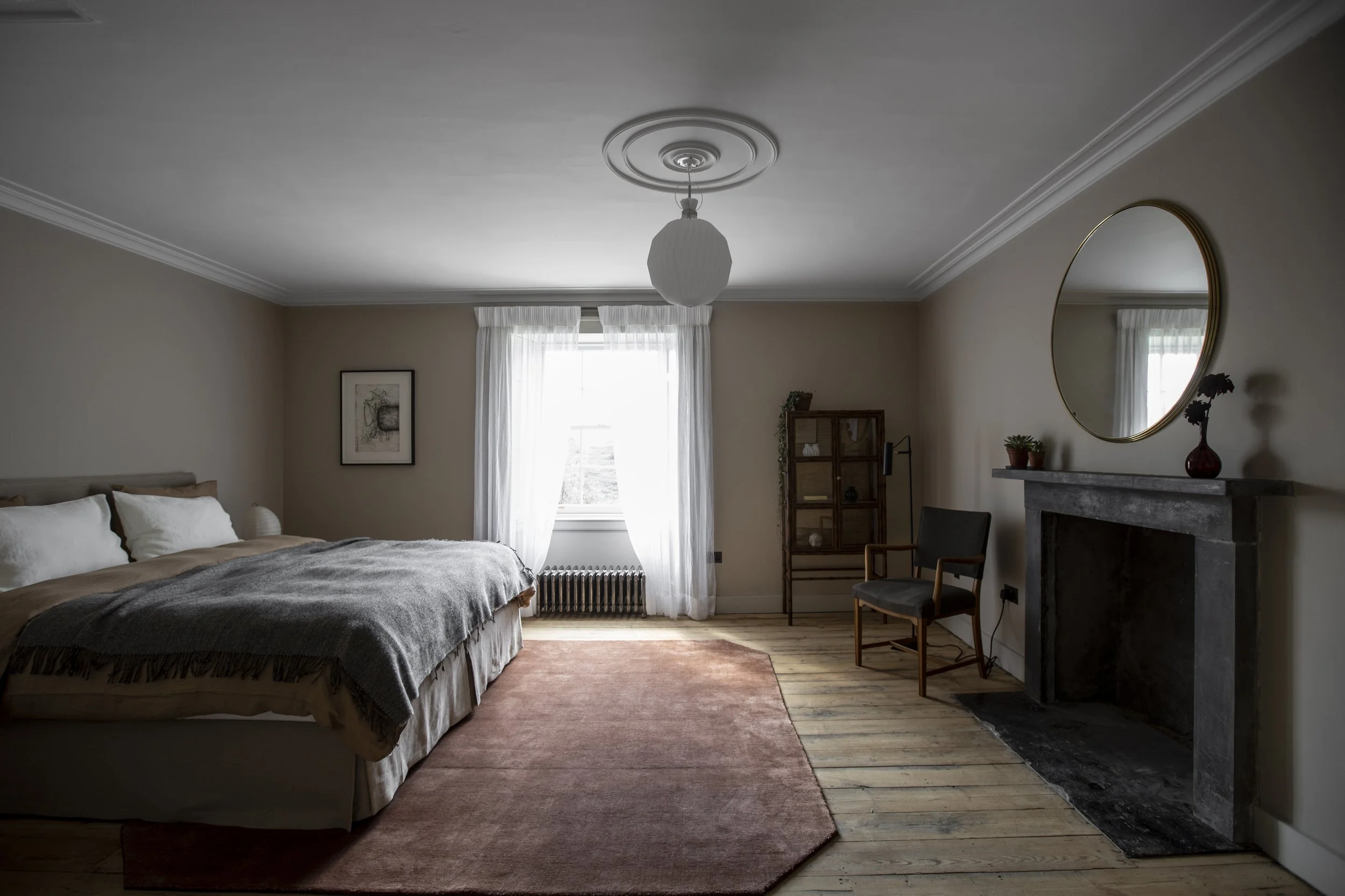 Behind the timeless stone façade of a 17th-century manse, Lundies House’s homely interiors blend modern Scandinavian design and warm Highland hospitality. Natural materials, vintage cabinetry and velvet sofas sit beside artworks by artists like Trine Søndergaard and Peter Blonde.