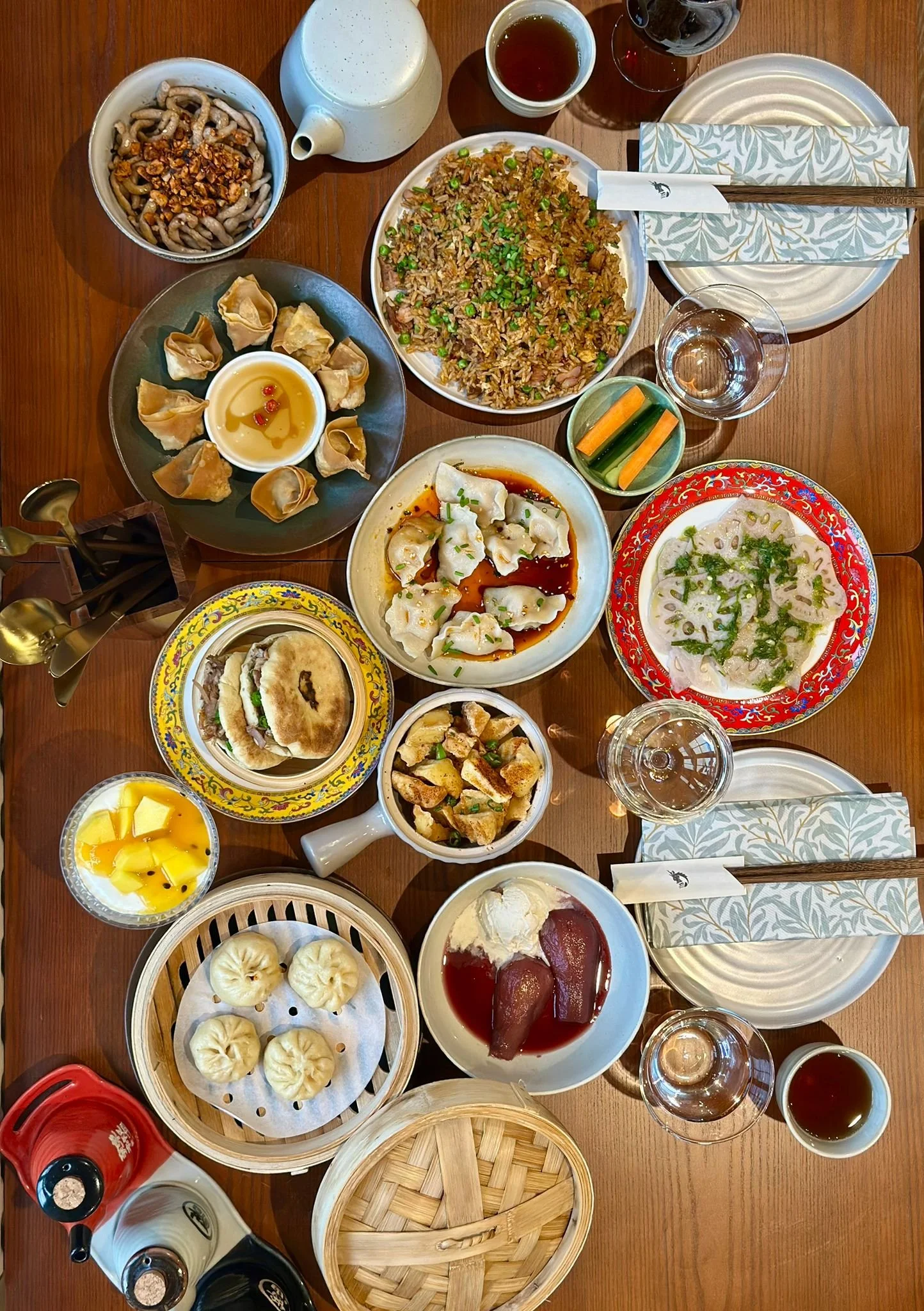 The food, designed for sharing, is closer to small-plate artistry than takeaway comfort. Kung Pao chicken skewers arrive glistening, garnished with cashews and house pickles; they’re sweet, sour and just spicy enough to make the wine sing. Roujiamo – a Chinese street-style burger stuffed with slow-braised pork, coriander and pepper – is a revelation: soft, rich and ideal for soaking up the next glass.
