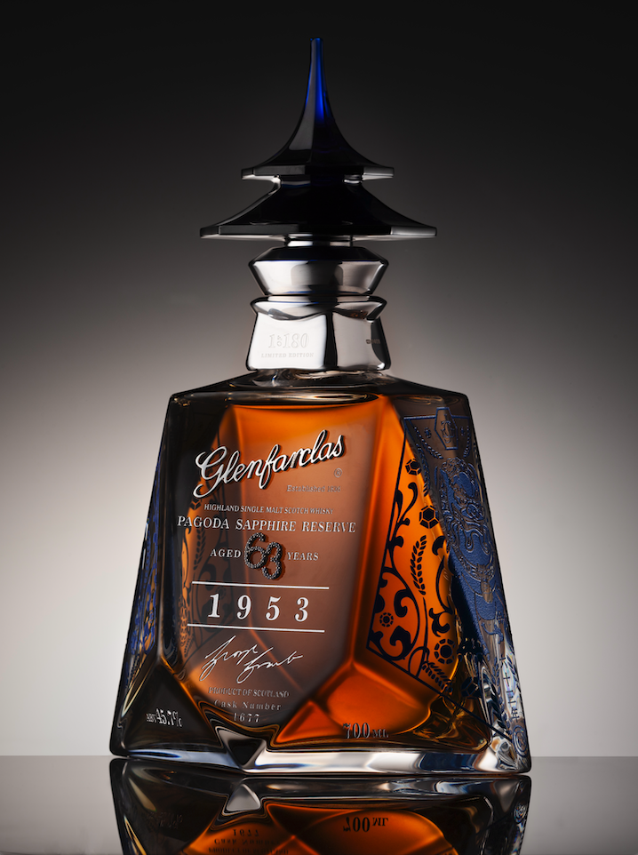 In 2020 Glenfarclas released its 63 Year Old Pagoda Sapphire Reserve in exquisite jewel encrusted Glencairn Crystal decanters.