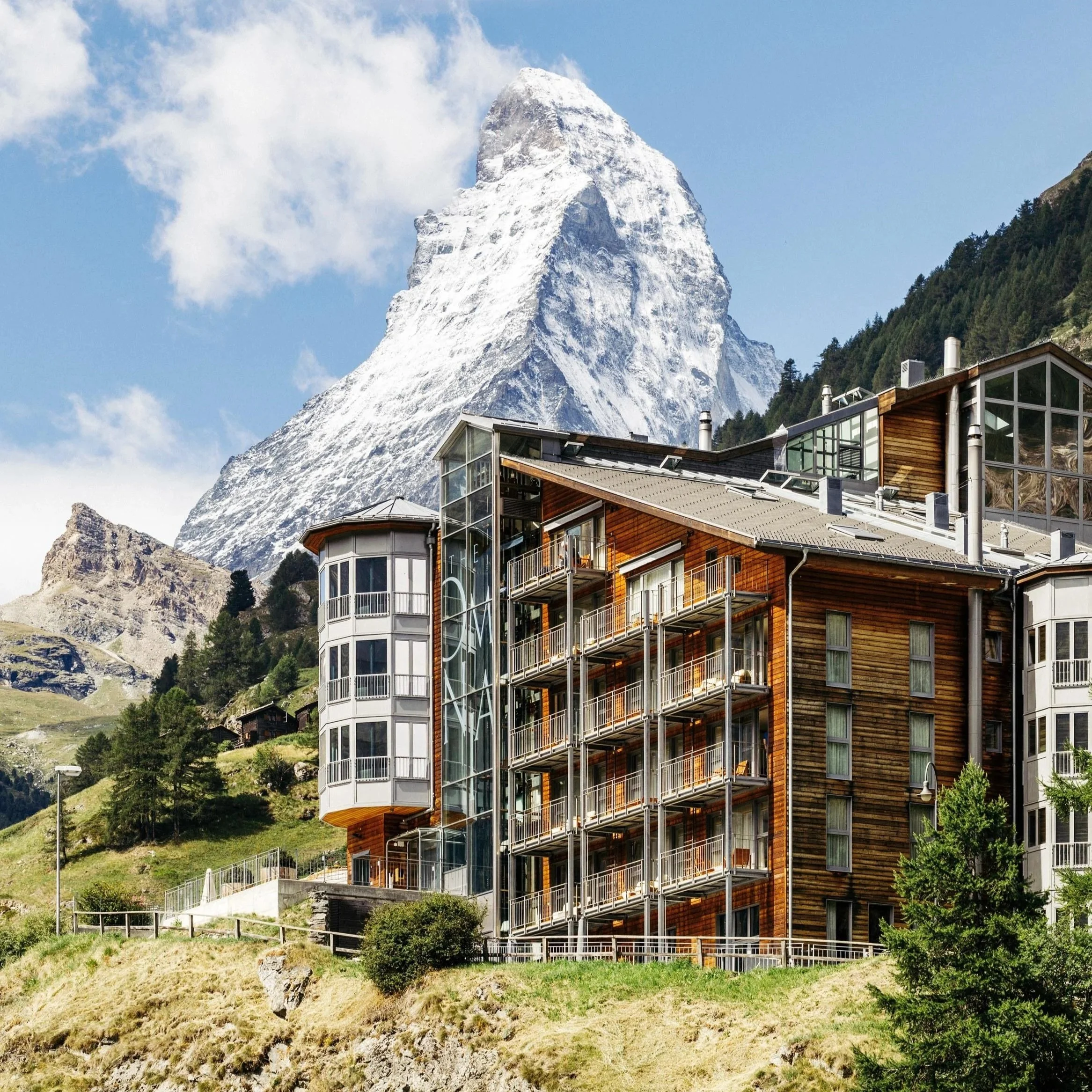 Carved into Zermatt’s cliff like a Bond lair with better bathrobes, the Omnia isn’t so much built in the mountain as part of it — a striking piece of modernism by New York architect Ali Tayar. Guests arrive through a candlelit tunnel and a private glass lift that glides up through the rock to the lobby, where light floods the timber interior. Inside, it’s all soaring spaces, Esher-like sculptural staircases that twist back and forth as they rise, and an effortless blend of American lodge and Swiss precision.
