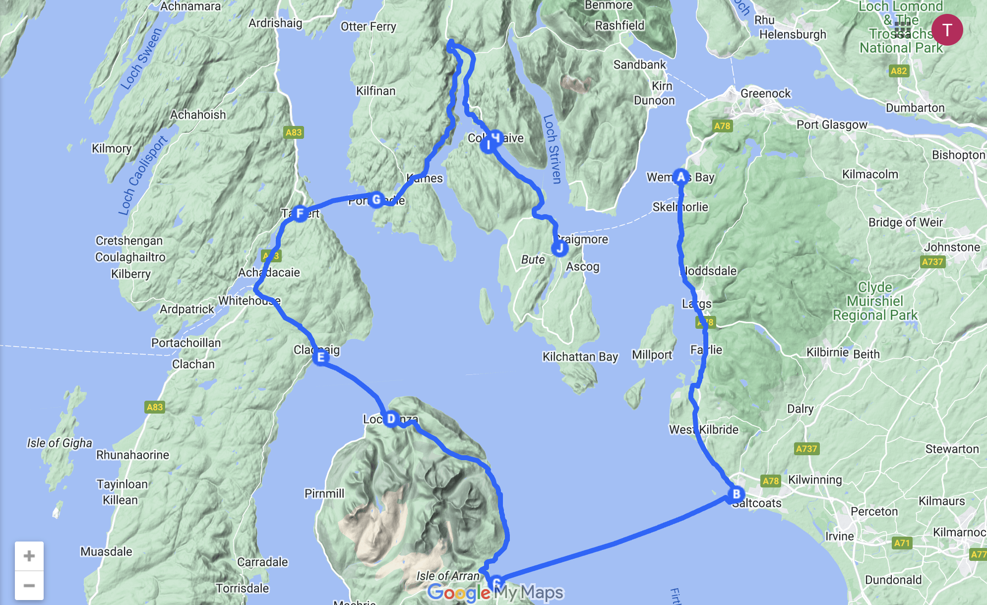 Scotrail run Trains from Glasgow Central to coincide with the ferries but these can be busy with other cyclists. The journey from Glasgow is about an hour. Also do not under estimate the time it takes to get from Glasgow to Wemyss Bay or Ardrossan by car. Allow an hour and a half minimum.